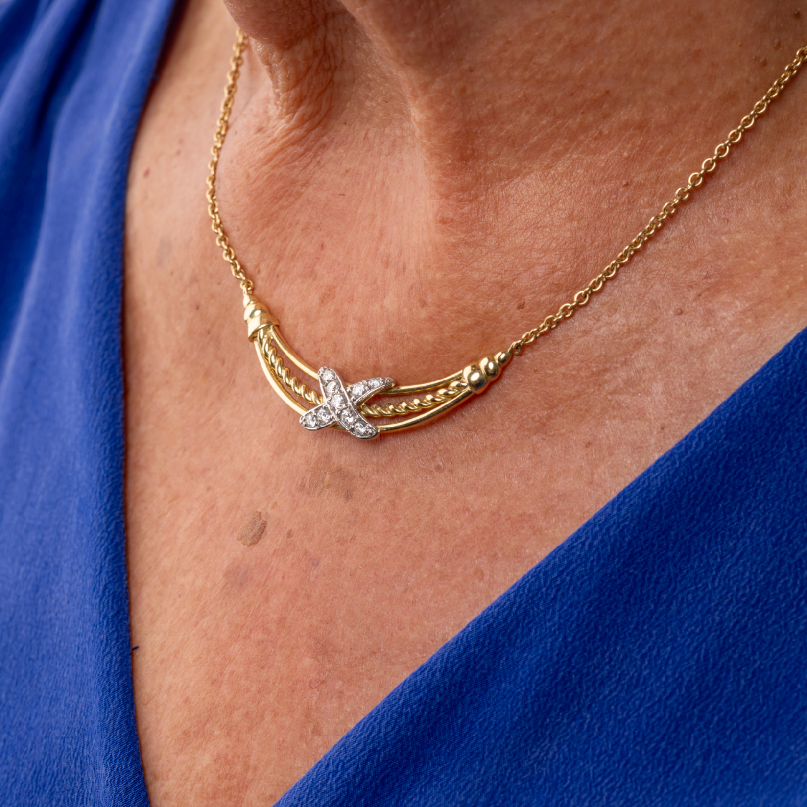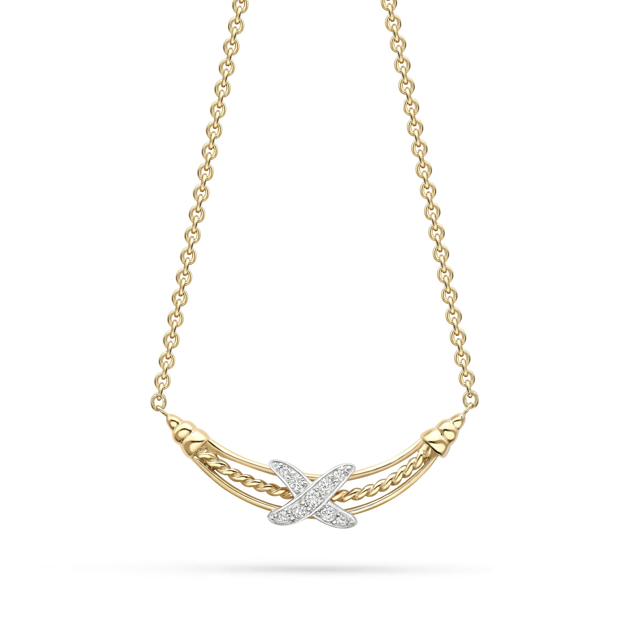 The proportions of the curve are designed so that the necklace flows seamlessly around the neck, from the chain through the curve.